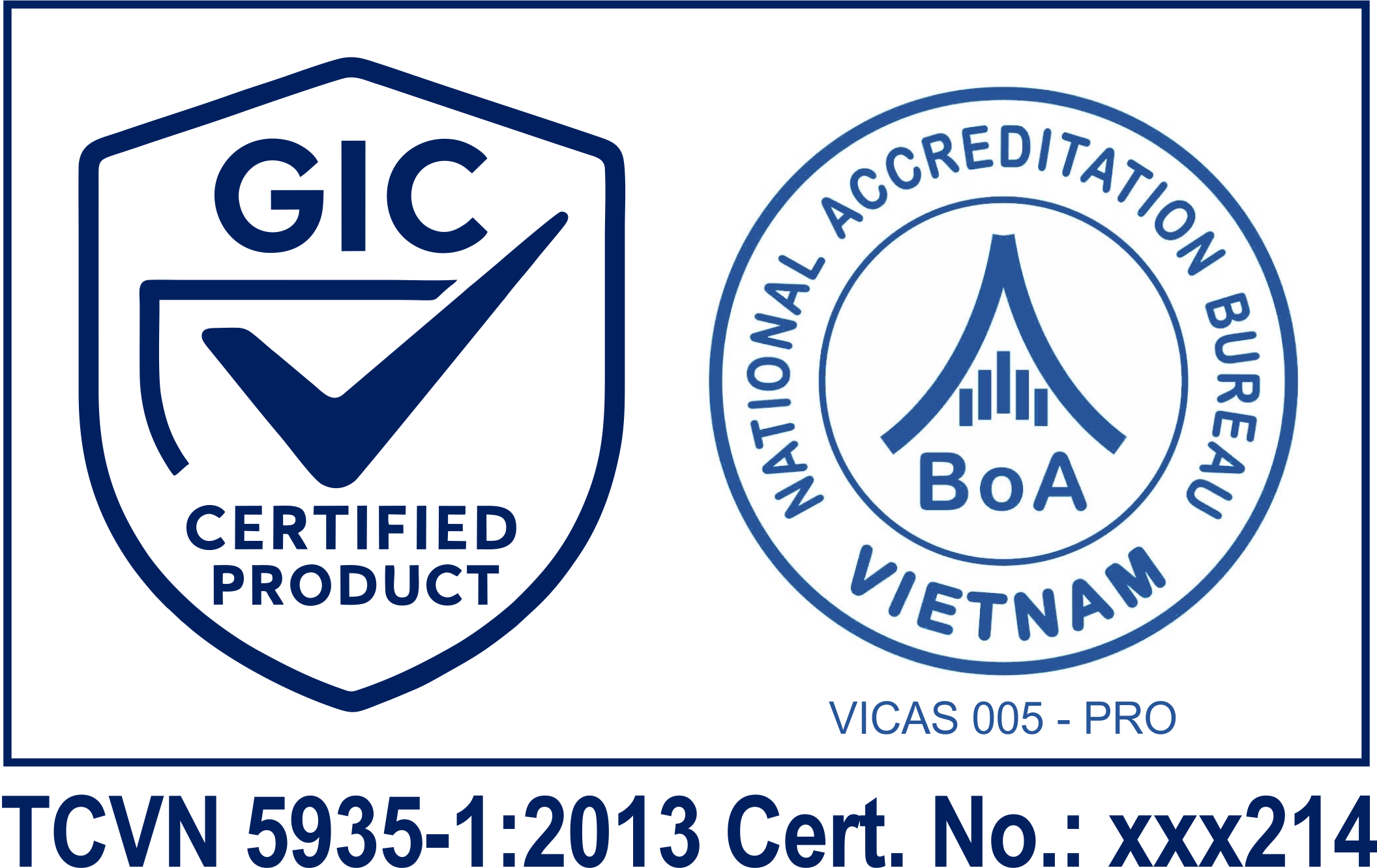 1- Biểu tượng (logo) chứng nhận được GIC Việt Nam cấp cho tổ chức, doanh nghiệp kèm theo số hiệu tiêu chuẩn, số chứng nhận (Cert. No.:) và dấu của tổ chức công nhận (nếu có).2- Sử dụng biểu tượng chứng nhận hệ thống quản lý: